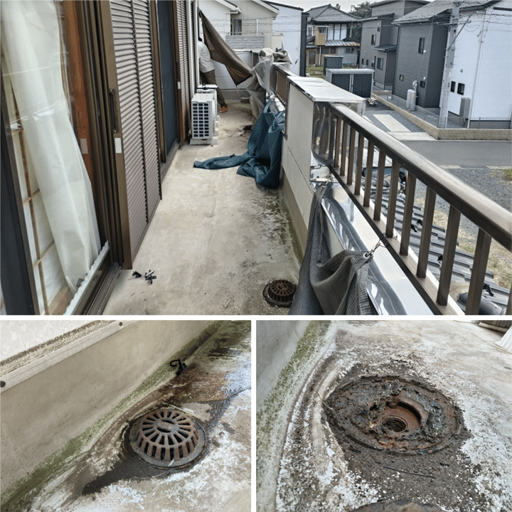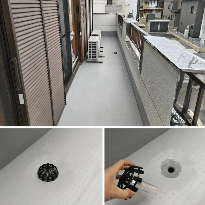 ベランダからの雨漏れはまだ起きていませんでしたが、今後のために早めに施工をしました。室外機を脱着をして、立ち上がりから床面まで新たなシートで一新させていただきました。排水口も新しく交換えおして、お掃除も簡単に出来る様になりました。今後の雨の心配も無くなり、安心してお住まいいただけます。