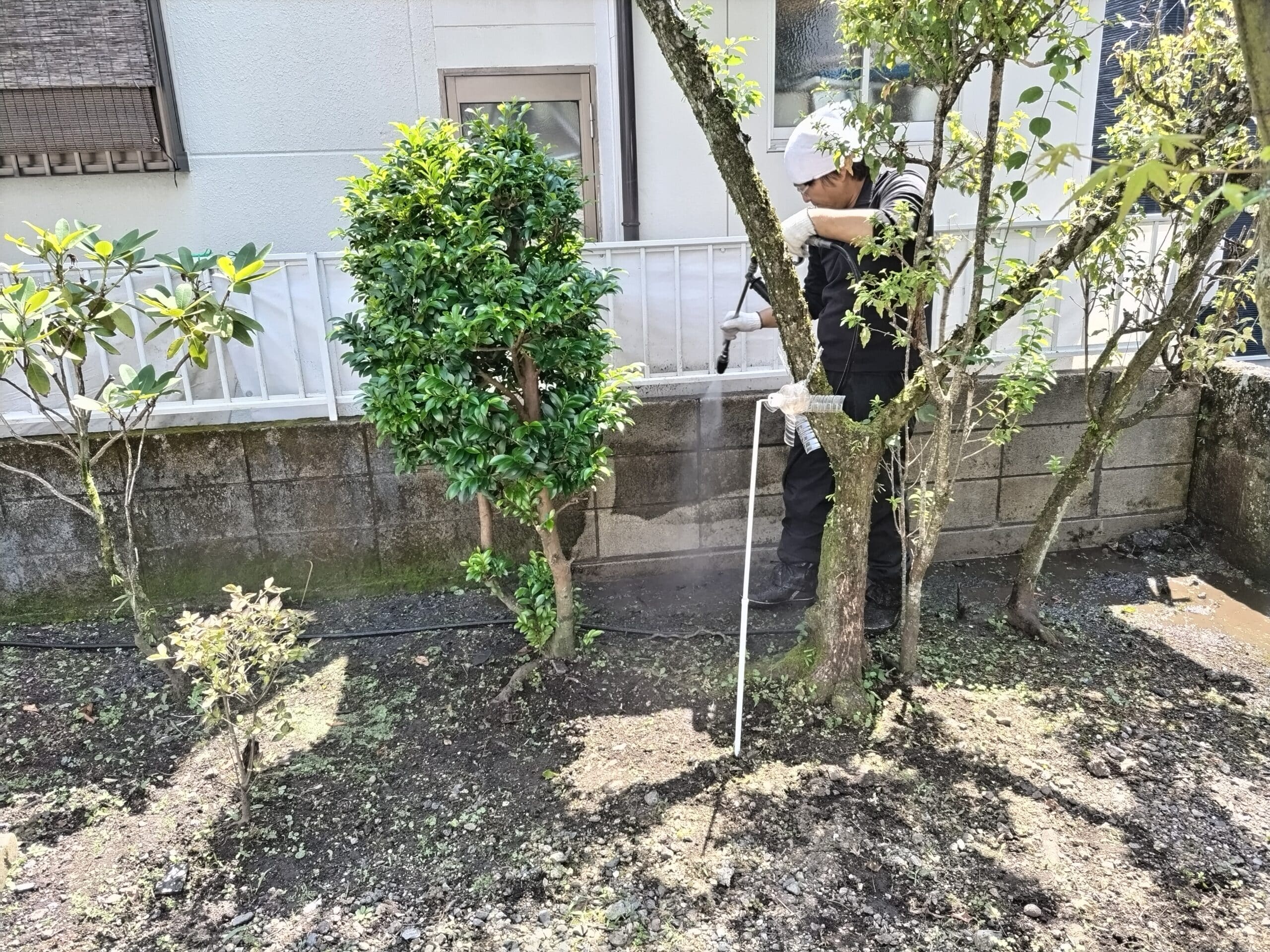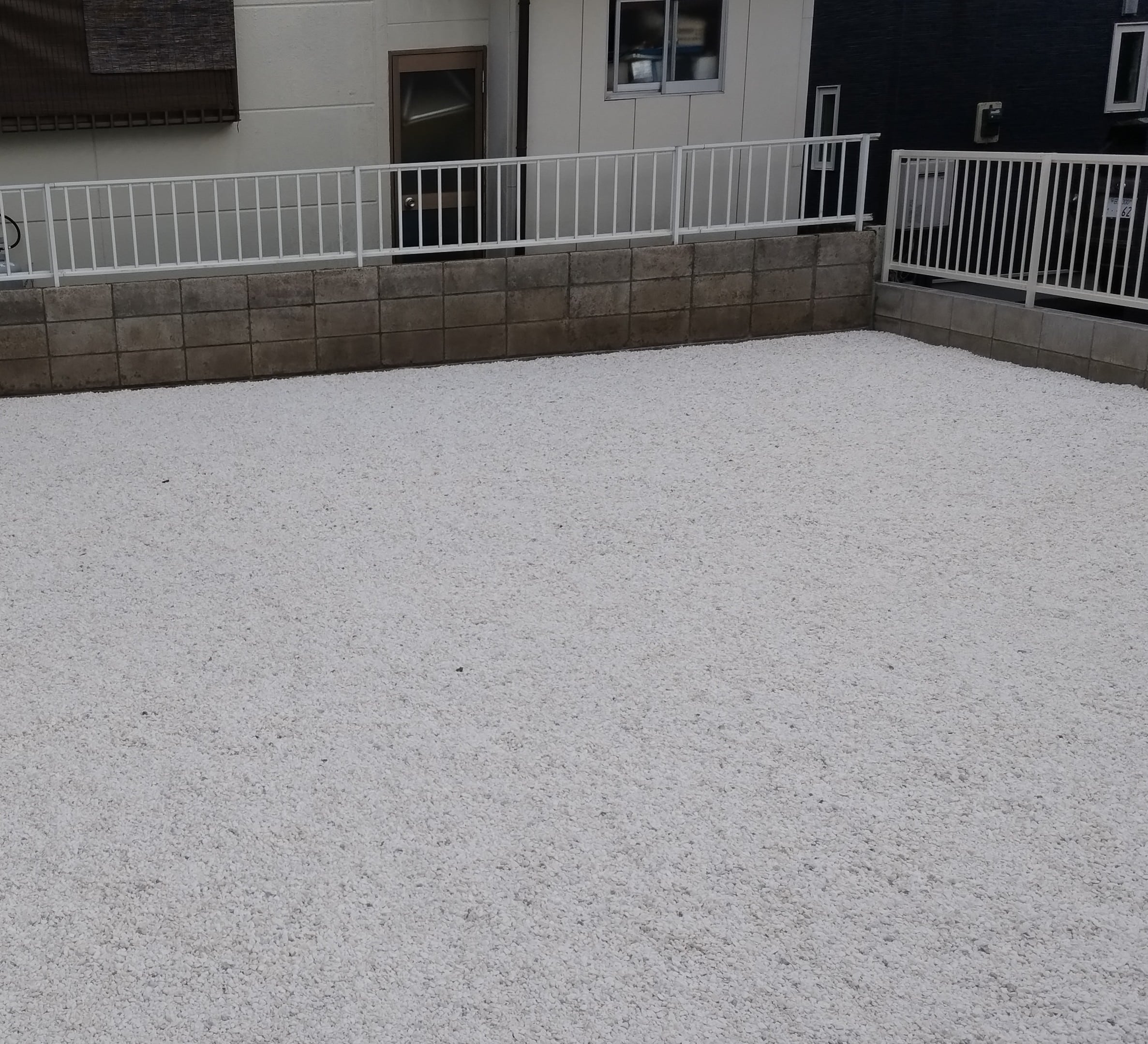 長年、雑草と鳥害で悩まれていた広めのお庭。伐採・伐根の上で防草シートを敷設、その上で石灰岩製の風情のある砂利を敷きお手入れ不要のお庭が完成。