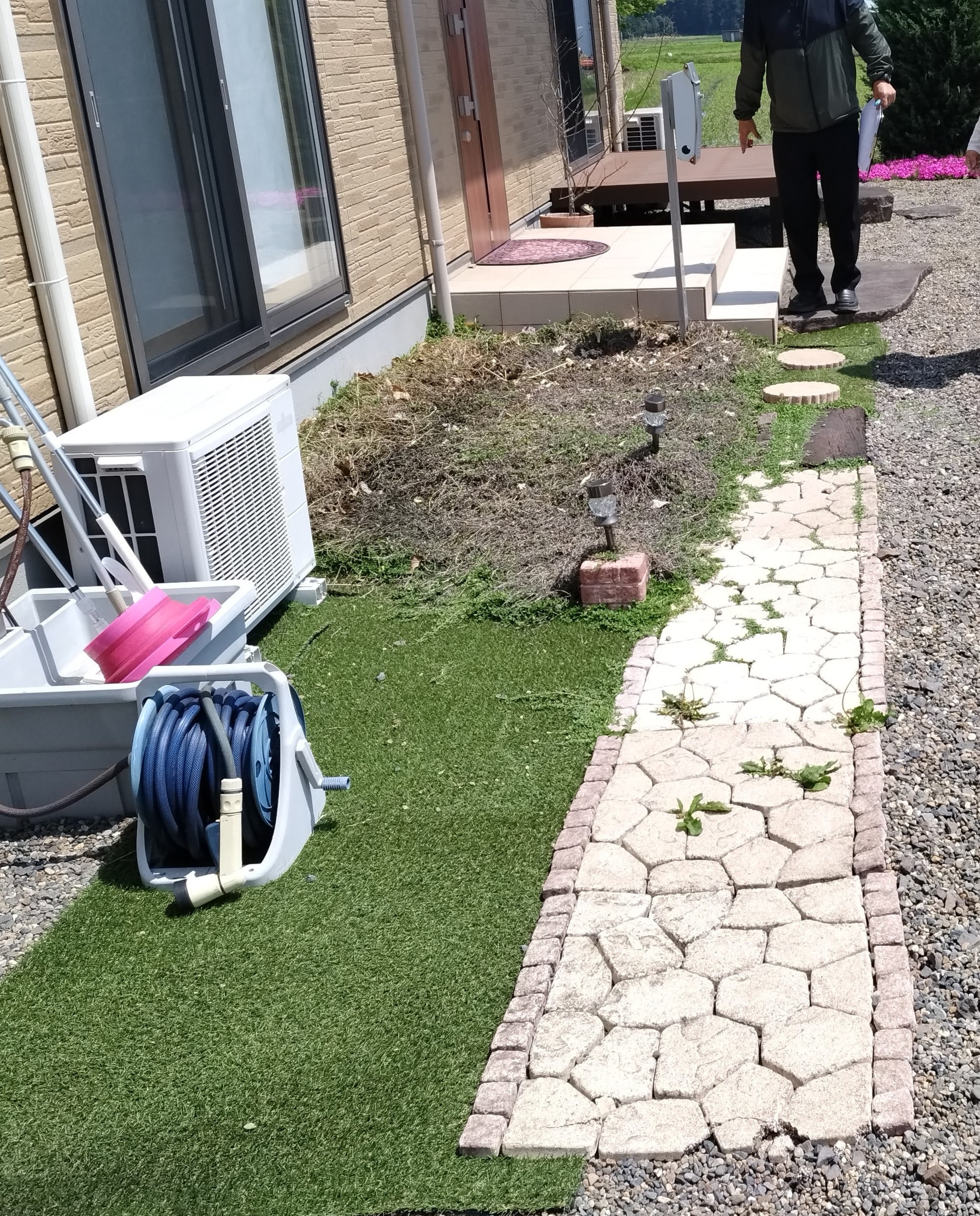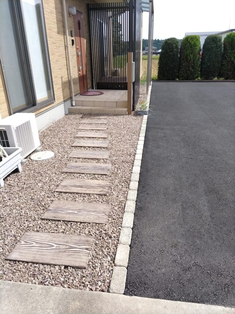 砂利敷き後も雑草に悩まされていた前庭・玄関アプローチが舗装と化粧砂利等で超スッキリに!